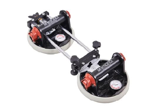 Prípravok je vybavený dvomi vákuovými prísavkami RAIMONDI RV175 (Ø175 mm) s gumovou podložkou, ktorá nezanecháva škvrny – vhodné pre hladké aj štruktúrované povrchy.